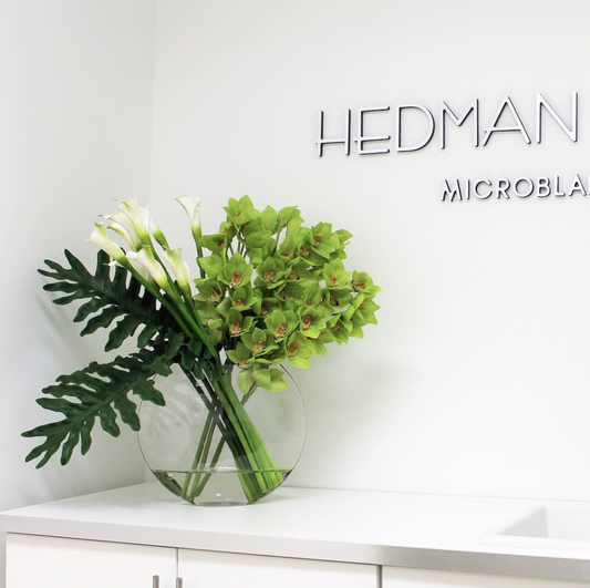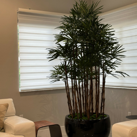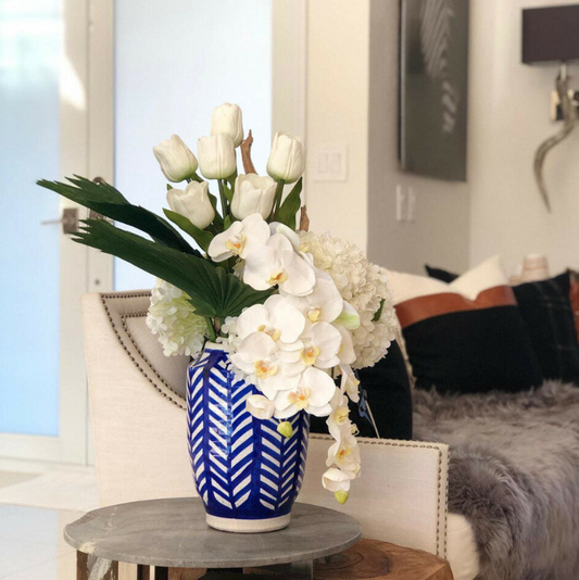 Tropical plant arreglo en cobalto azul esférico maceta.