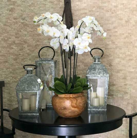 grande vivo borde teca jarrón con blanco vanda orquídeas