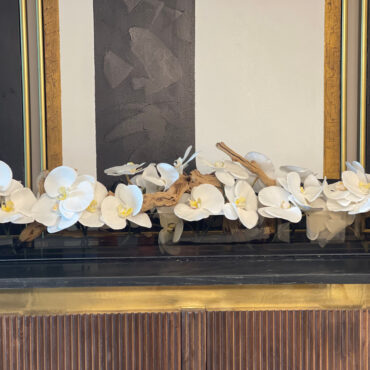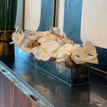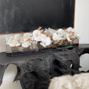 Macetero de cristal negro tintado Casa Moderna de 36" con orquídeas Phalaenopsis blancas, madera de vid tratada con chorro de arena, piedras blancas y nuestra agua de imitación. La impresionante vista de unas orquídeas Phalaenopsis en plena floración es nada menos que sobrecogedora. Sus enormes y curvados pétalos; dobles hileras de preciosas flores desfilan a lo largo de nuestro macetero de placa de cristal Casa Moderna. Este macetero de cristal moderno y translúcido