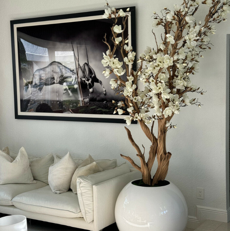 Exhibido sobre un tronco real, las flores de magnolia aportan alegría y elegancia en cualquier estación. Ya sea en el vestíbulo de entrada o en un rincón especial de la habitación, este árbol artificial se convierte en un encantador punto focal.