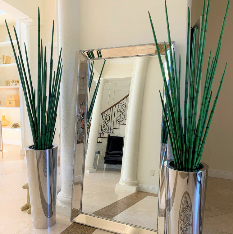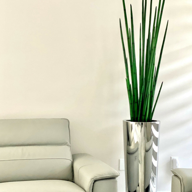 La máxima expresión de lujo. Este gran cono de acero inoxidable pulido se combina con hierba serpiente artificial. Cada pieza está cuidadosamente elaborada y pulida para lograr un acabado espejado y lujoso. ¡No es necesario regar tus plantas! Son duraderas, durarán años y permanecerán hermosas durante todo el año. Diseñadas con la máxima atención al detalle y fabricadas con materiales de alta calidad, nuestras plantas son lujosas y realistas.
