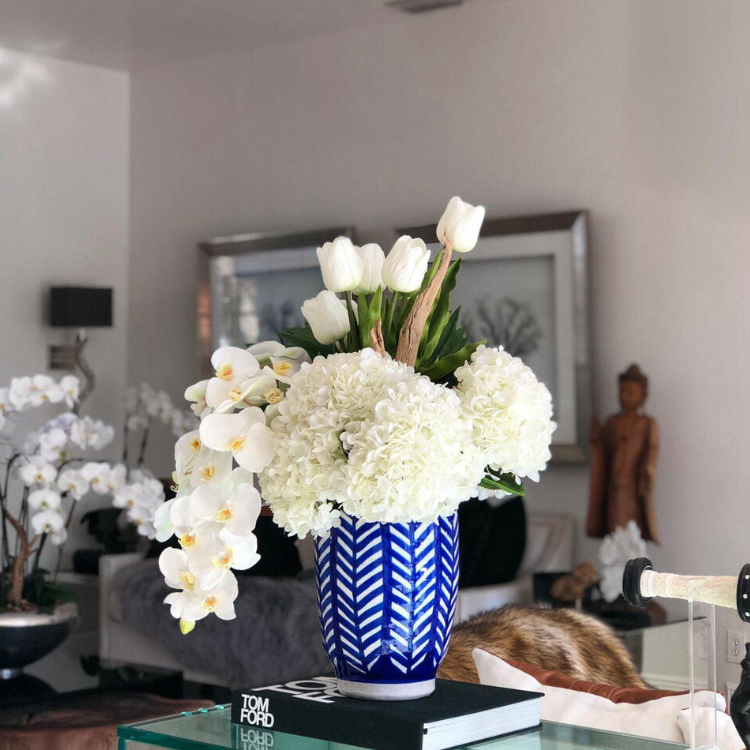 Jarrón Inca con patrón a rayas y ramo mixto de orquídeas blancas, hortensias, tulipanes y hojas de palma estrella.