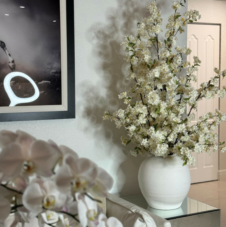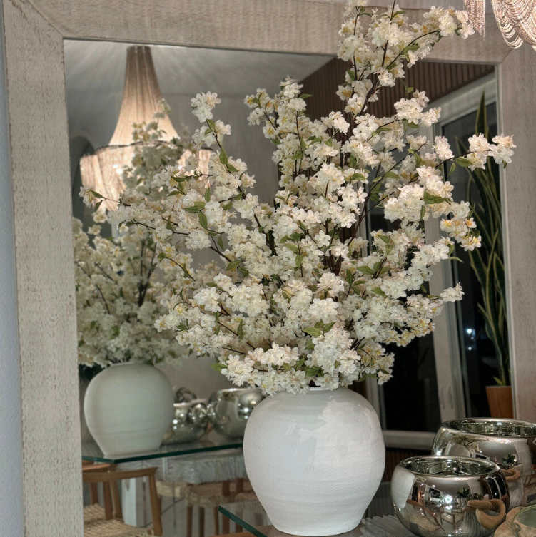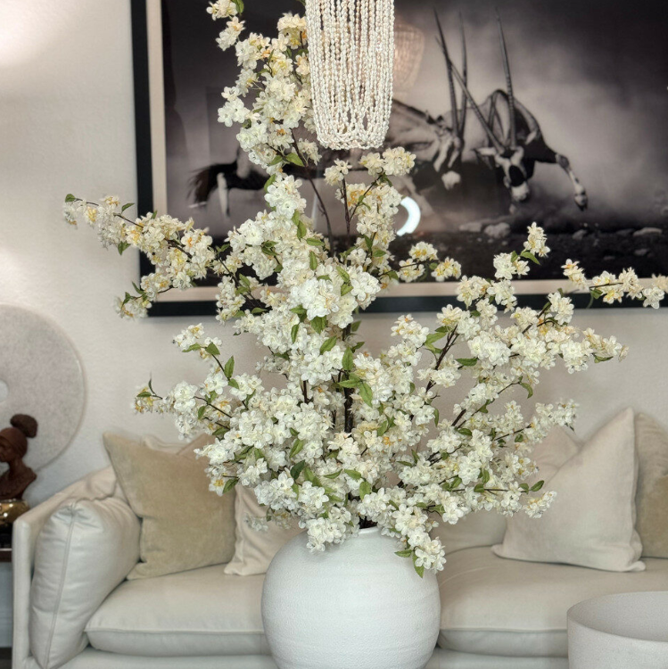Las flores de cerezo son un símbolo de la primavera, un momento de renovación y de la naturaleza efímera de la vida. Colocadas en el Jarrón Konos, un jarrón redondeado de cemento con un acabado blanco texturizado, su tamaño y forma proporcionan el telón de fondo perfecto para nuestros altos tallos de flor de cerezo blanca. Esta elegante rama de flor de cerezo blanca añade un toque fresco y sofisticado a cualquier espacio.