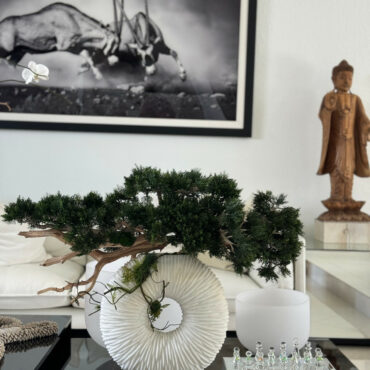 Con una forma redonda siempre elegante y elemental, este jarrón eternity de color beige mate, combinado con un bonsái colgante y madera de deriva, es un acento ideal para crear un punto focal llamativo en su espacio. Su majestuosa forma de bonsái y su diseño único son justo lo que se necesita para aportar elegancia y estilo a una habitación. Elaborado a mano
