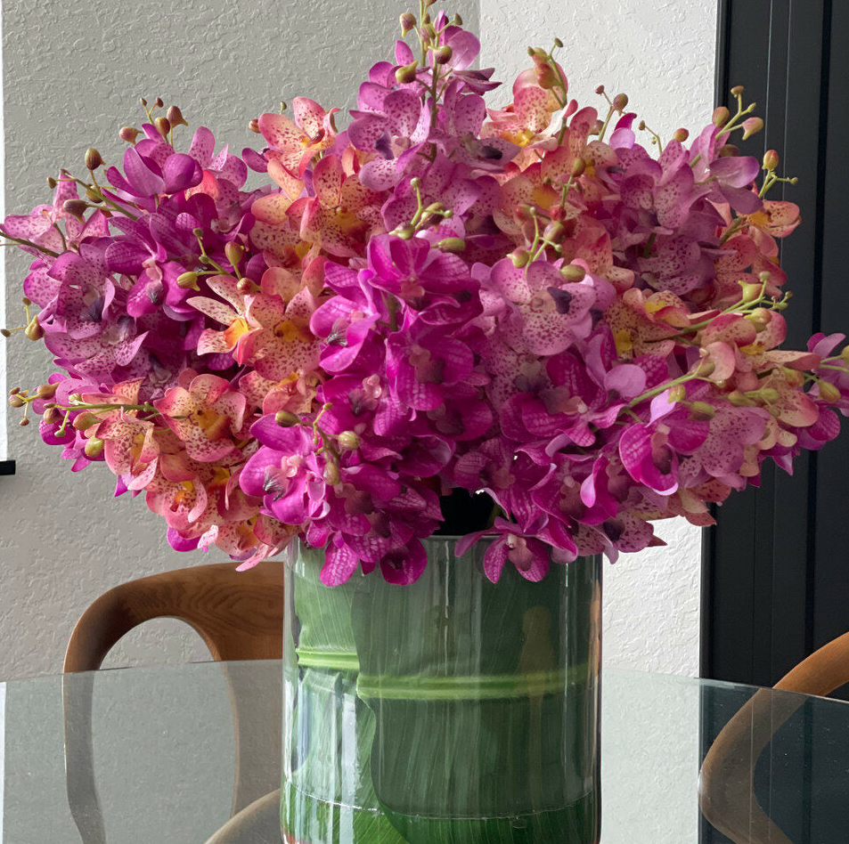 Un impresionante centro de mesa lleno de vibrantes orquídeas artificiales Mokara Vanda. Decora tu espacio con una belleza que nunca se desvanece. Con las orquídeas artificiales adecuadas, los centros de mesa pueden permanecer hermosos durante muchos años. Este lujoso arreglo de orquídeas Vanda artificiales no requiere mantenimiento.