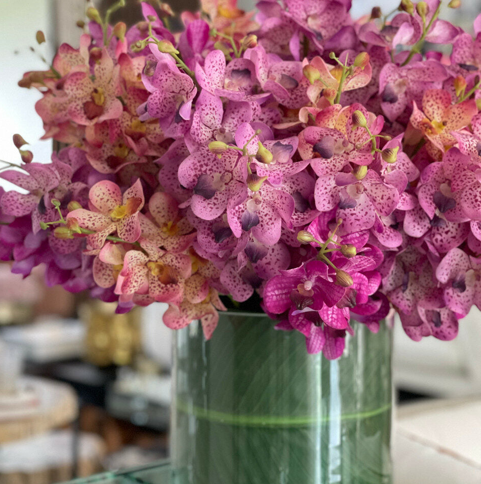 Para la creación de este arreglo de orquídeas artificiales de tamaño mediano se utilizan materiales de calidad premium y artesanía hecha a mano. Las flores de orquídea Vanda de alta calidad con tacto real reposan sobre nuestro gran cilindro de vidrio Rota, rodeadas de exuberantes hojas verdes de Ave del Paraíso.